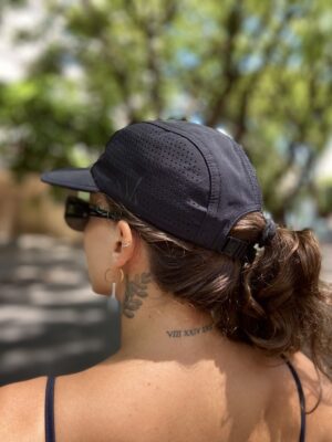 Boné com 6 gomos na cor preto bordado em branco.