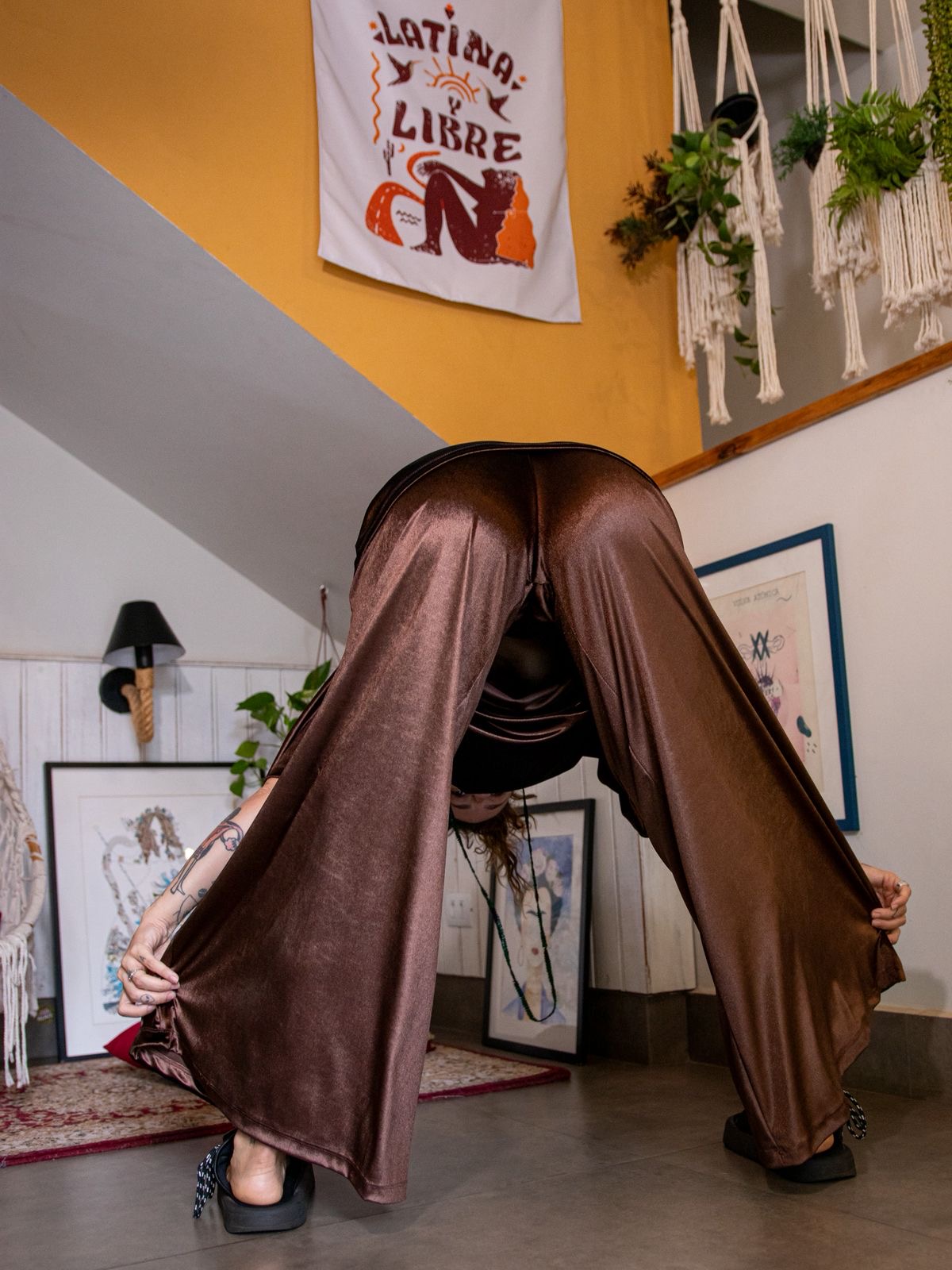 Calça em tecido 100% poliéster, cós de ribana com elástico e barra boca de sino sem costura.
