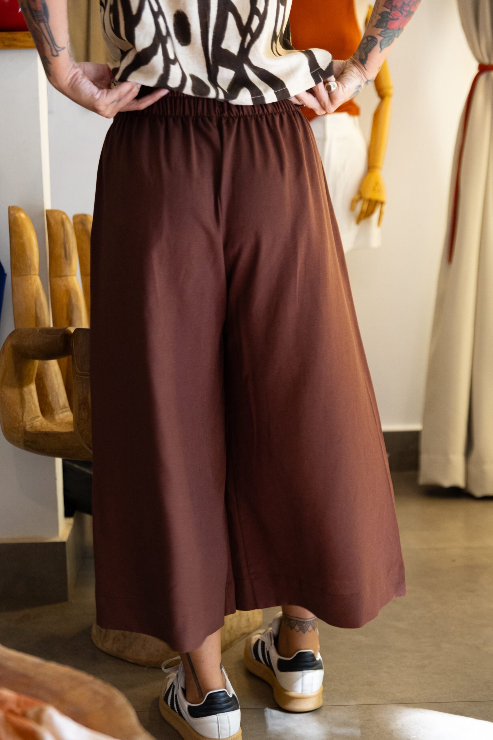 Calça com corte da perna bem amplo, comprimento midi e bolsos laterais.