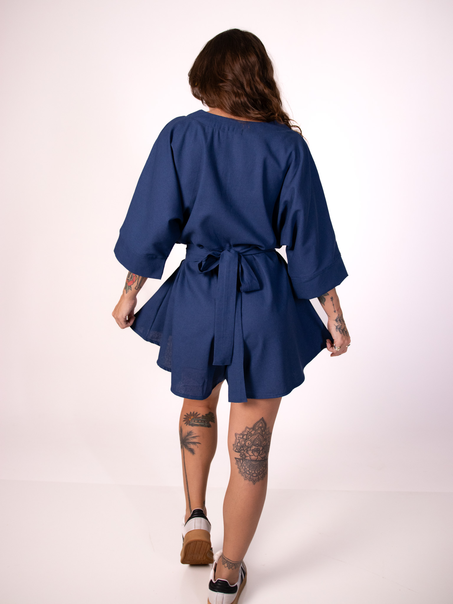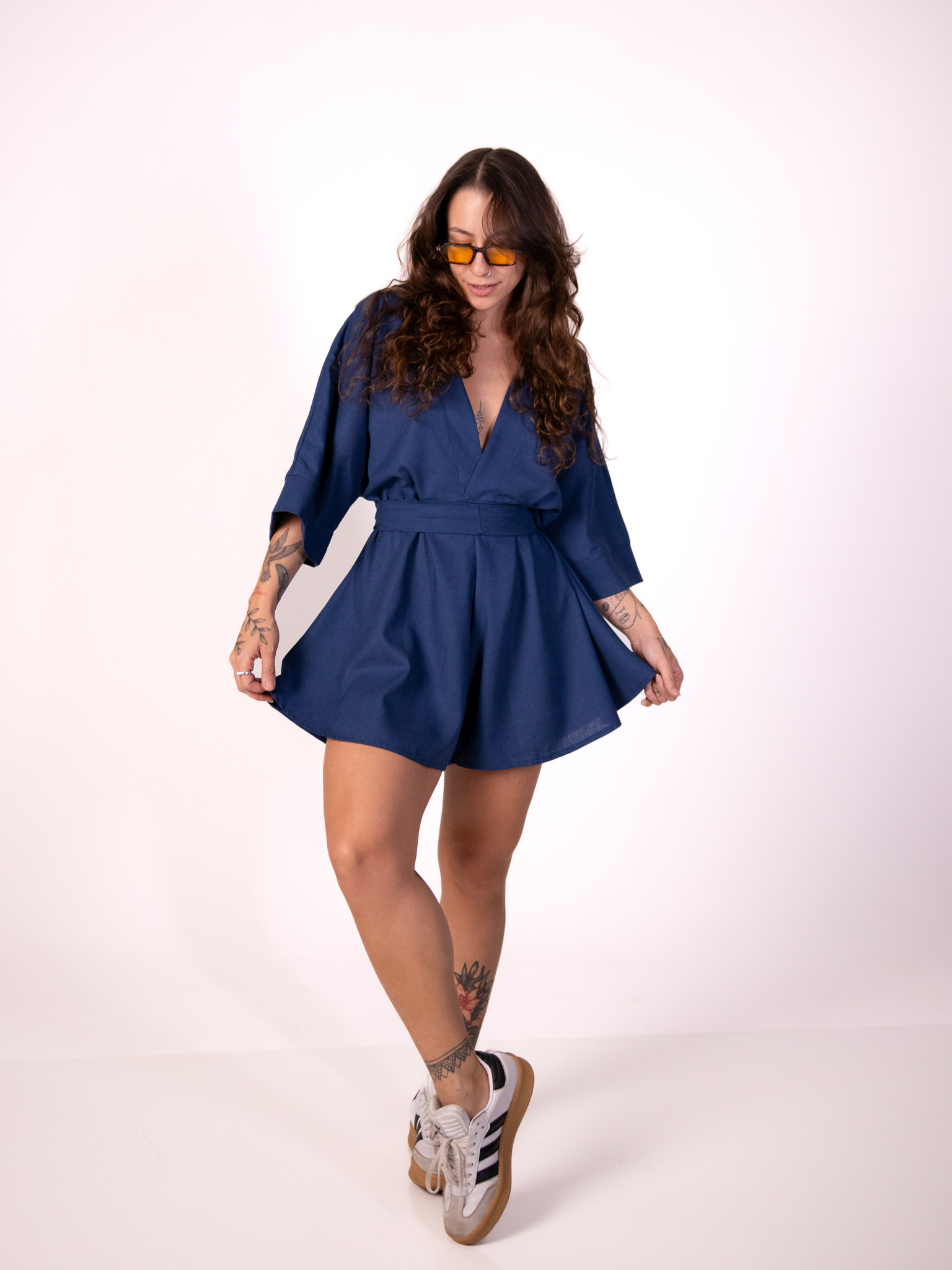 Macaquinho com manga morcego, decote V na frente, costas fechada, shorts godê e faixa para amarrar na cintura.
