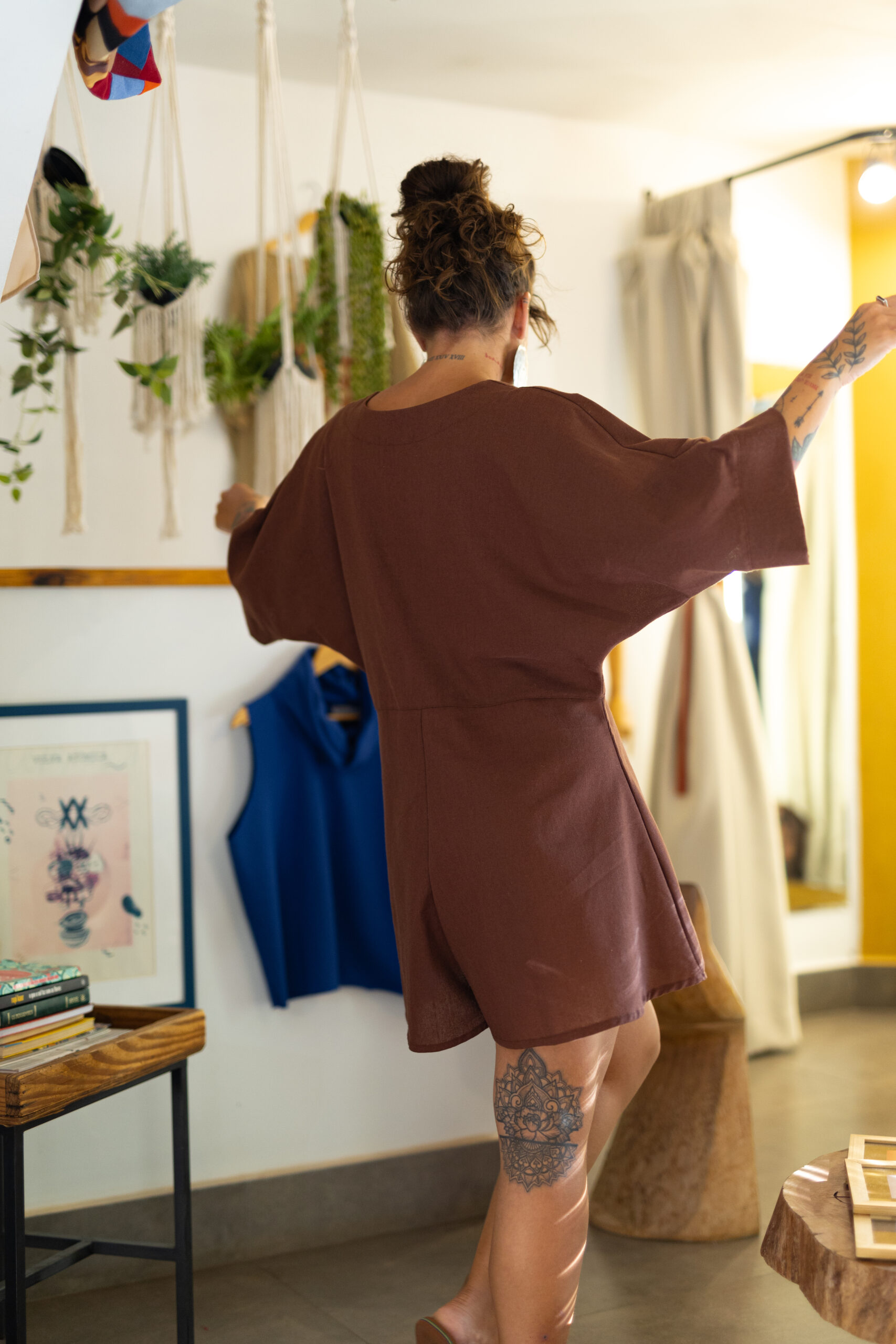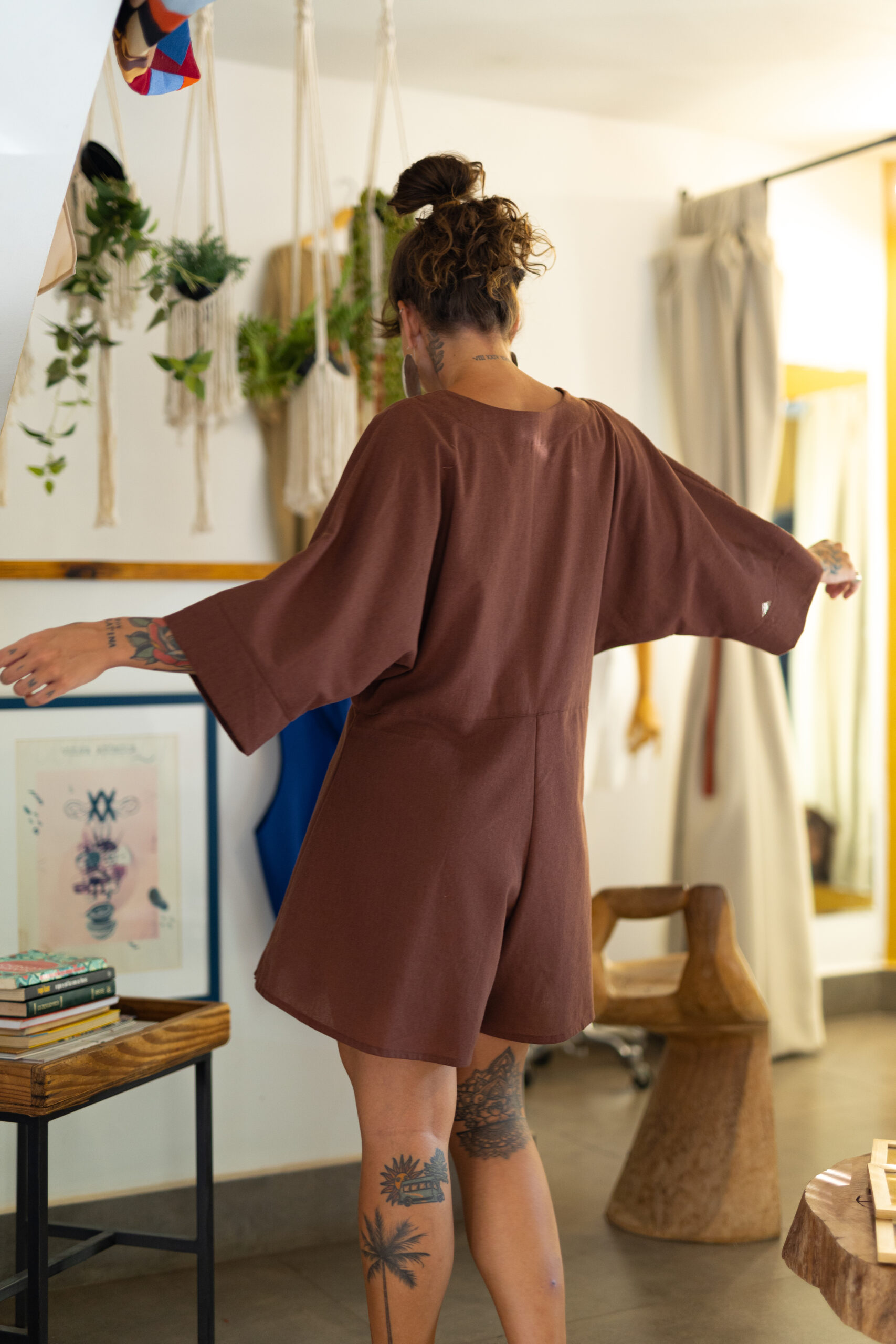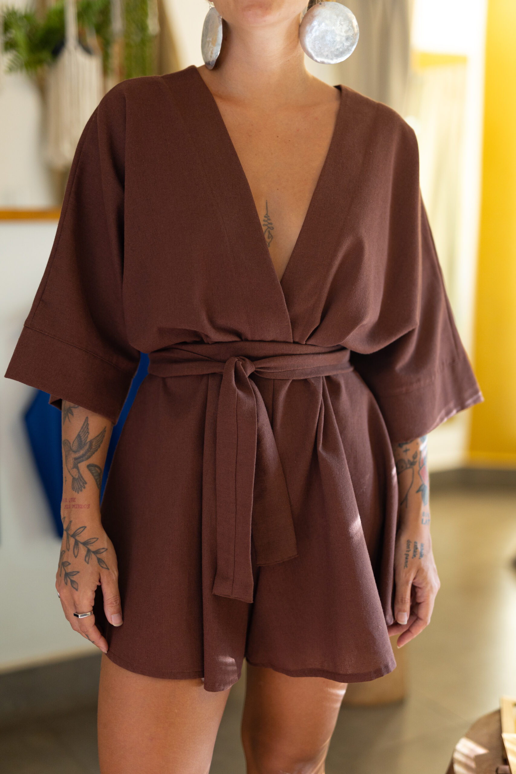 Tecido 70% viscose e 30% linho, manga morcego, decote V na frente, costas fechada, shorts godê e faixa para amarrar na cintura.