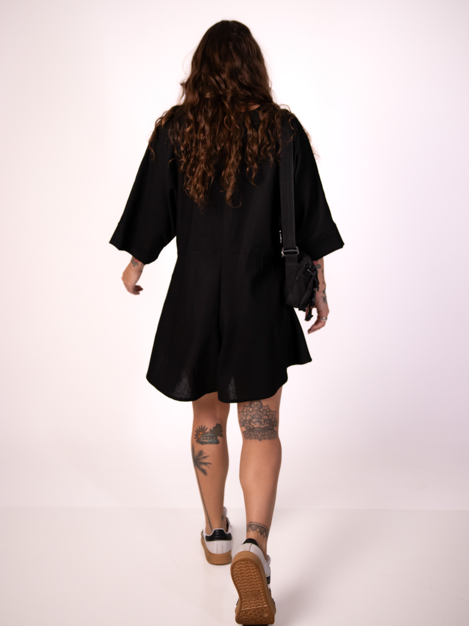 Tecido 70% viscose e 30% linho, manga morcego, decote V na frente, costas fechada, shorts godê e faixa para amarrar na cintura.