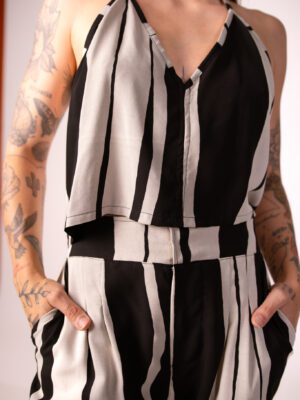 Calça pantalona alfaiataria, com fecho em zíper e colchete, elástico no cós (na parte de trás) e bolso nas laterais.